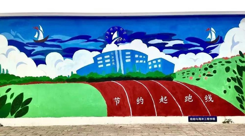 墙绘设计兼顾学院特色,激励学子们在知识的海洋里不畏艰险、扬帆起航,新校区新环境新起点。同时结合绿色生态发展和节约型校园建设理念,以勤俭节约作为船院学子的起跑线,旨在培养可持续发展观念,实现学校内部师生与自然的良性互动,建设环境友好的校园环境。