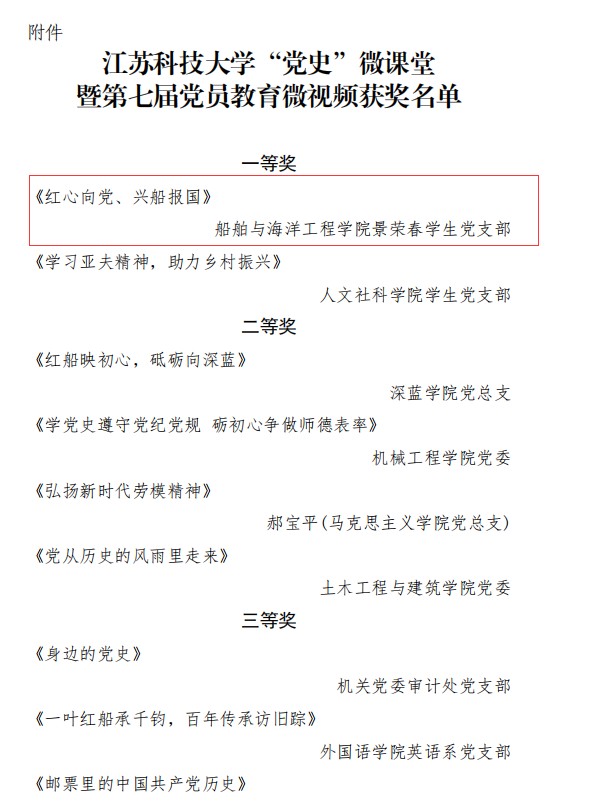 自公司党委组织开展“党史”微课堂暨第七届党员教育微视频征集评比活动以来,betway西汉姆联景荣春员工党支部党员积极参与,围绕中国共产党百年奋斗光辉历程,创作了思想性艺术性俱佳、富有感染力的优秀作品——《红心向党、兴船报国》,并荣获一等奖。