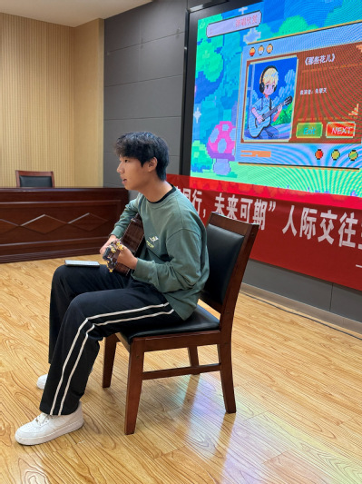 本次班会突破传统模式,以“像素游戏闯关”为创新载体,将人际交往知识与趣味体验深度融合,实现“在玩中学、在学中悟”的育人目标。开场环节,通过PPT系统讲解人际交往对个人成长与团队凝聚的双重价值,提炼“尊重理解、换位思考、有效沟通、互助共赢”四大原则,为同学们构建科学社交认知框架;吉他弹唱《那些花儿》,以温暖旋律拉近同窗距离,在美育浸润中营造温馨氛围,缓解社交疏离感。